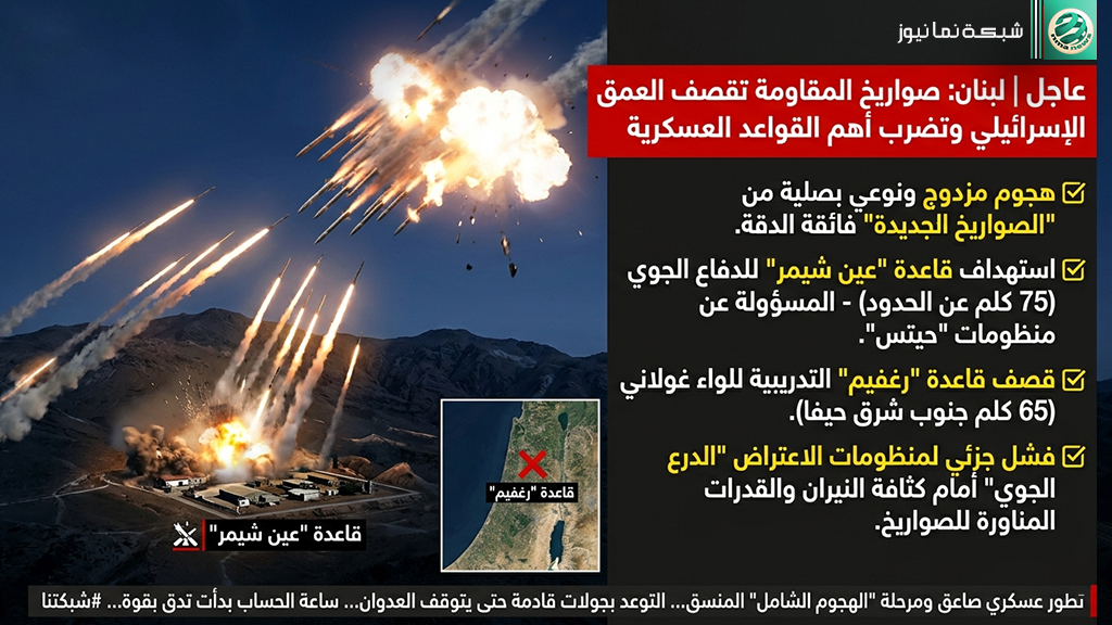 استهداف المقاومة الإسلامية لقاعدتي عين شيمر و**”رغفيم”** يمثل ذروة جديدة في منحنى التصعيد، ورسالة نارية تتجاوز حدود الجغرافيا المعتادة للمعركة.
