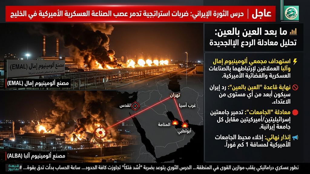 في تصعيد دراماتيكي يقلب موازين القوى في المنطقة، أعلن حرس الثورة الإيراني فجر اليوم عن تنفيذ ضربات استراتيجية استهدفت مجمعين صناعيين عملاقين للألومنيوم في الإمارات والبحرين، مؤكداً أنهما مرتبطين بالصناعات العسكرية والفضائية الأميركية.