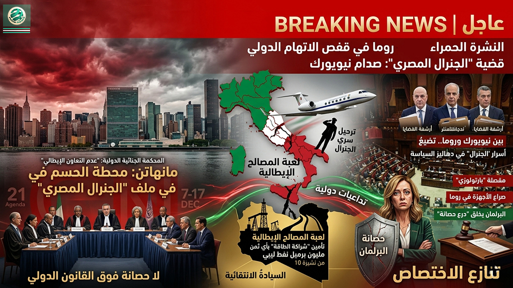 🚨 النشرة الحمراء : "روما في قفصِ الاتهام.. 'قضية المصري' تُشعلُ مواجهةً كبرى بين إيطاليا والمحكمة الدولية" ⚠️ (تقرير استراتيجي: اليوم 35 للحرب - تدويل أزمة ترحيل الجنرال الليبي وصراع الأجهزة في روما)
